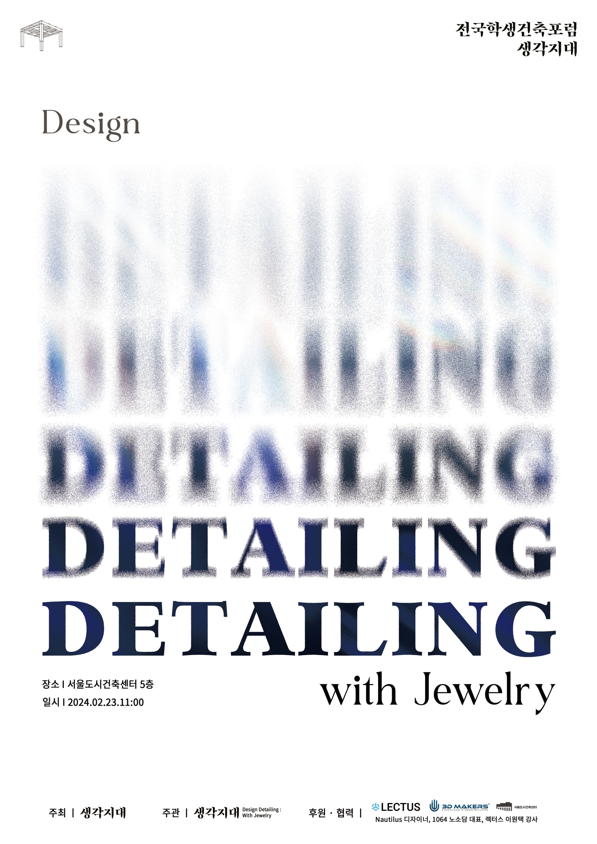 본 기획단은 이러한 현상 속에서 건축학도인 우리가 감동하는 디테일의 의미를 ‘Detailing’이 아닌 ‘Detailed Object’로 받아들이게 되는 오류를 정정할 기회를 만들어보고자 합니다. 고안의 과정인 디테일에 대한 연구를 위해 본 기획단은 ‘쥬얼리’라는 도구를 빌려왔습니다.